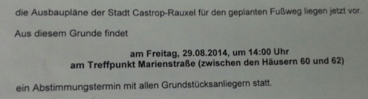 Der Termin für die Begehung ist der 6.5.2014 um 12 Uhr (dieser wurde heute von der Stadt bestätigt, falls der Termin abgesagt wird gibt es eine Info). Es wurde kein Treffpunkt genannt. Die letzten Treffen sind an der Kreuzung Marienstraße Ecke Am Scheitensberg gestartet. Nach dem aktuellen Stand geht es nur um das letzte Stück Fußgängerweg zwischen Marienstraße und dem 1. Stich Am Scheitensberg.